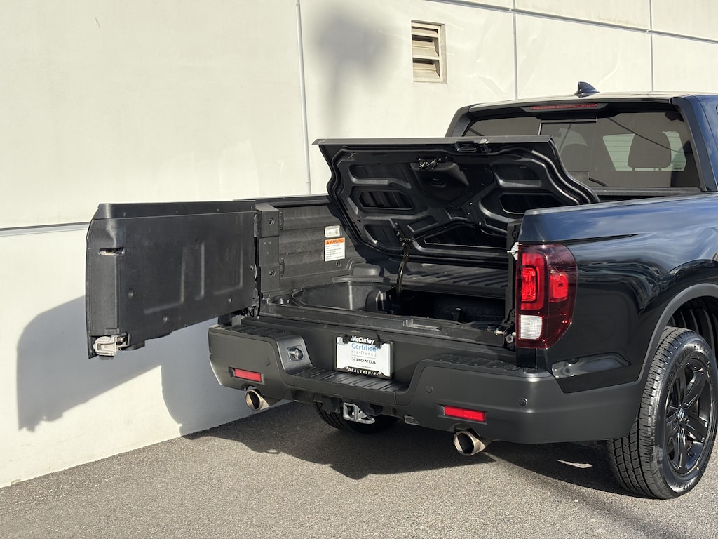 Introducing the 2023 Honda Ridgeline Black Edition AWD, a perfect blend of robust performance and refined style. This stunning pickup features an eye-catching Crystal Black Pearl exterior that seamlessly complements its sophisticated black interior. Powered by a 3.5L V-6 engine with gasoline direct injection and i-VTEC variable valve control, this vehicle delivers an impressive 280 horsepower while maintaining efficiency with its innovative cylinder deactivation. As a certified pre-owned vehicle, this Ridgeline ensures you get both quality and value. The all-wheel drive capability provides exceptional traction and stability, making it ready for any adventure, whether on the road or off the beaten path. The Black Edition's enhancements include exclusive styling elements that set it apart from the crowd, making it a standout choice for those who desire versatility and elegance. Experience the comfort and advanced technology features that Honda is renowned for, all packed into this powerful yet refined pickup. Don't miss out on the chance to own this exceptional 2023 Honda Ridgeline Black Edition. Perfect for work, play, and everything in between.